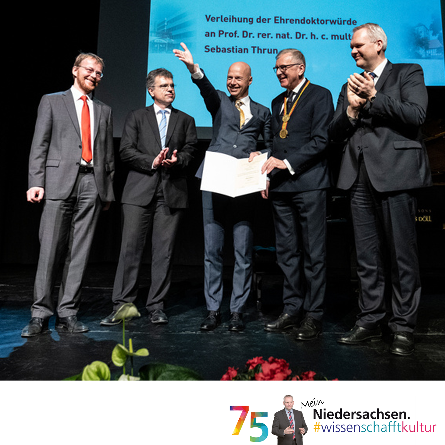 »Sebastian Thrun hat von 1986 bis 1988 als einer der ersten Studenten Informatik an der Universität Hildesheim studiert. Heute gilt er als Pionier der Robotik, als einer der einflussreichsten Denker in der Welt der Künstlichen Intelligenz und als Mitbegründer des selbstfahrenden Autos. Er dürfte damals als Student in Hildesheim wohl kaum geahnt haben, dass ihm die Universität drei Jahrzehnte später für seine herausragenden wissenschaftlichen Leistungen im Fach Informatik die Ehrendoktorwürde verleihen würde. Mir war es im Januar 2020 eine große Freude, an dieser Feierstunde teilzunehmen und die anhaltende Verbundenheit dieses herausragenden Wissenschaftlers mit der Stiftung Universität Hildesheim zu erleben – jener Universität, die den akademischen Grundstein für dieses außergewöhnliche Wirken als Wissenschaftler, Forscher und Unternehmer legte.«