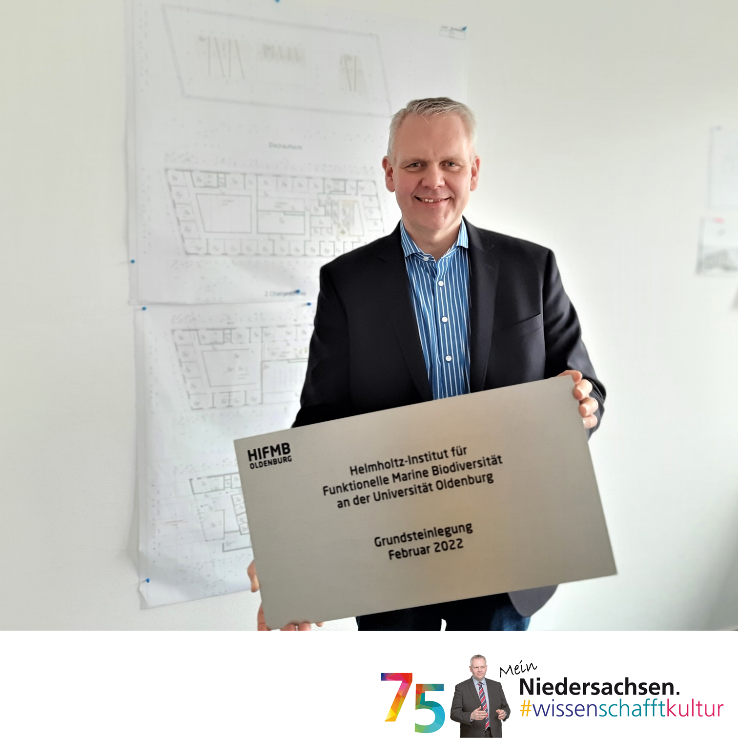 »Mit ihrer Erforschung mariner Ökosysteme leisten die Wissenschaftlerinnen und Wissenschaftler am Helmholtz-Institut für Funktionelle Marine Biodiversität (HIFMB) einen wichtigen Beitrag zum Verständnis des Klimawandels. Da mir sowohl die Küsten- und Meeresforschung als auch die Forschung im Bereich des Klimawandels Herzensangelegenheiten sind, ist das HIFMB ein besonderer Ort. Es ist schön, persönlich mitzuerleben, wie das junge Institut wächst und gedeiht. In die Höhe wächst derzeit auch der von uns mit 15 Millionen Euro geförderte Neubau in Oldenburg. Gern habe ich im Juli 2021 für den symbolischen Spatenstich zur Schippe gegriffen und nun im Februar 2022 bei der coronakonformen Grundsteinlegung mitgewirkt. Denn ich bin mir sicher, dass das neue Büro- und Laborgebäude als neue Heimat für das HIFMB ideale Forschungsmöglichkeiten bieten und den für Forschung und Lehre unerlässlichen Austausch fördern wird, damit wir alle von zukunftsweisenden Konzepten für eine nachhaltige Nutzung der Meere und einer wissenschaftlichen Grundlage für einen besseren Meeresschutz profitieren können. Das Video zur Grundsteinlegung könnt ihr unter https://hifmb.de/de/neubau/ ansehen.«
