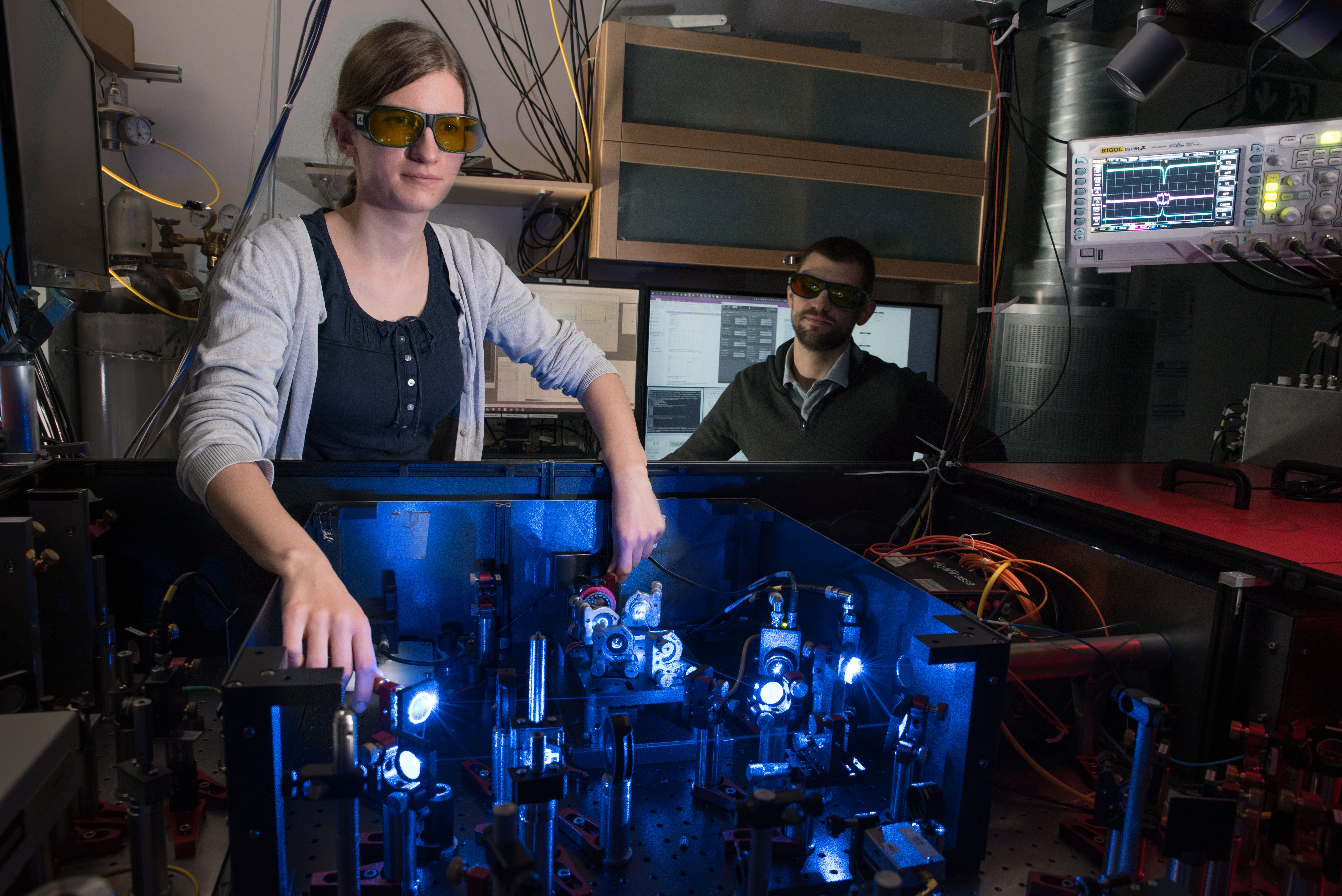 Im Quantencomputer-Forschungslabor der Leibniz Universität Hannover: Teresa Meiners justiert einen Laser zur Präparation der Ionen-Qubits; Giorgio Zarantonello bedient derweil die Steuerung des Aufbaus.