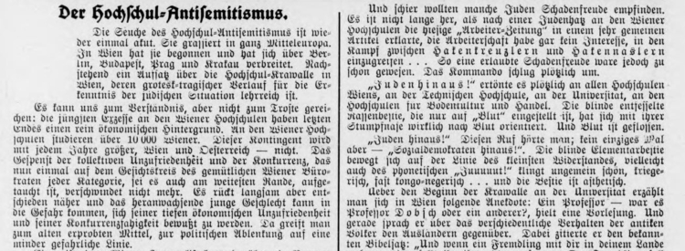 Regelmäßig berichtet das Nachrichtenblatt der Synagogengemeinde über antisemitische Gewalt an Hochschulen, die an vielen Hochschulen präsent war.   Bildrechte: Quelle: Nachrichtenblatt 1929, Nr. 47 v. 29. November, S 1.