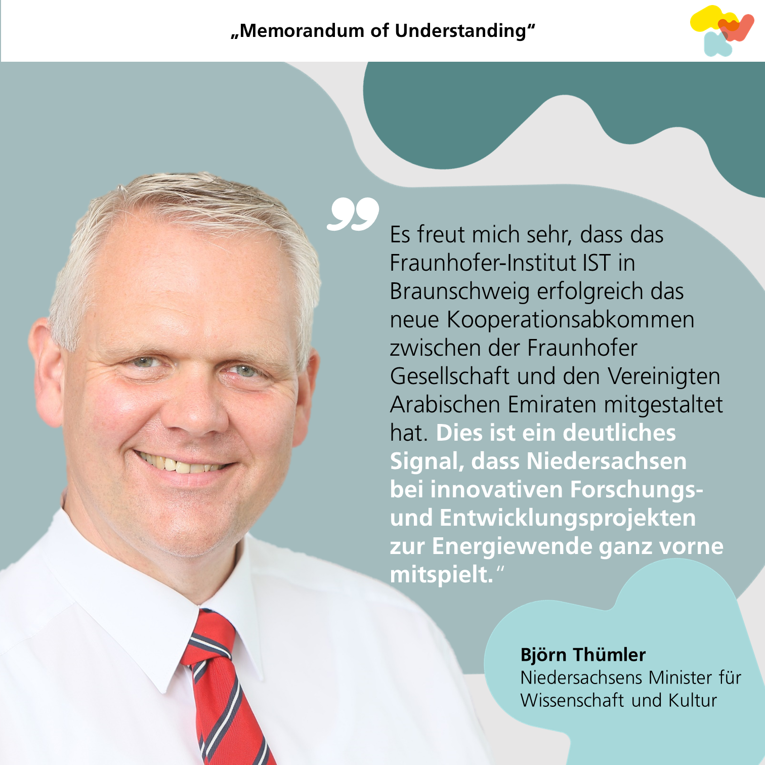 »Grüner Wasserstoff ist ein zentraler Baustein für die Energiewende und – wie wir derzeit deutlich spüren – für unsere künftige Energiesicherheit. Internationale Forschungskooperationen und Zusammenarbeit sind wichtige Instrumente für den Übergang zu nachhaltiger Energie. Daher freut es mich sehr, dass das Fraunhofer Institut für Schicht- und Oberflächentechnik in Braunschweig erfolgreich das neue Kooperationsabkommen zwischen der Fraunhofer-Gesellschaft und den Vereinigten Arabischen Emiraten mitgestaltet hat. Dies ist ein deutliches Signal, dass Niedersachsen bei innovativen Forschungs- und Entwicklungsprojekten zur Energiewende ganz vorne mitspielt.«