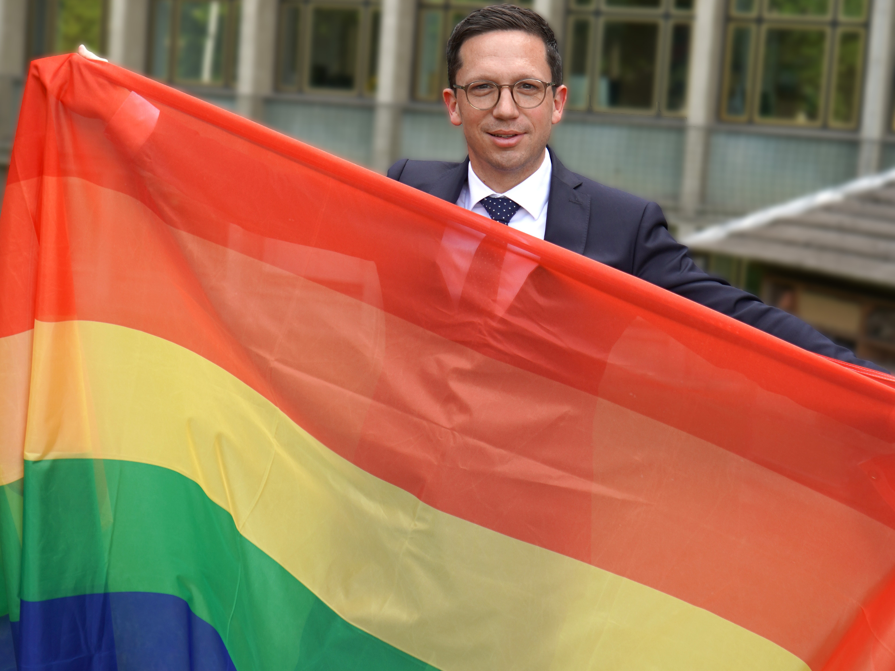 Anlässlich des Internationalen Tags gegen Homo-, Bi-, Inter*-,Trans*-, und Asexuellenfeindlichkeit hat das MWK die Regenbogenflagge gehisst.