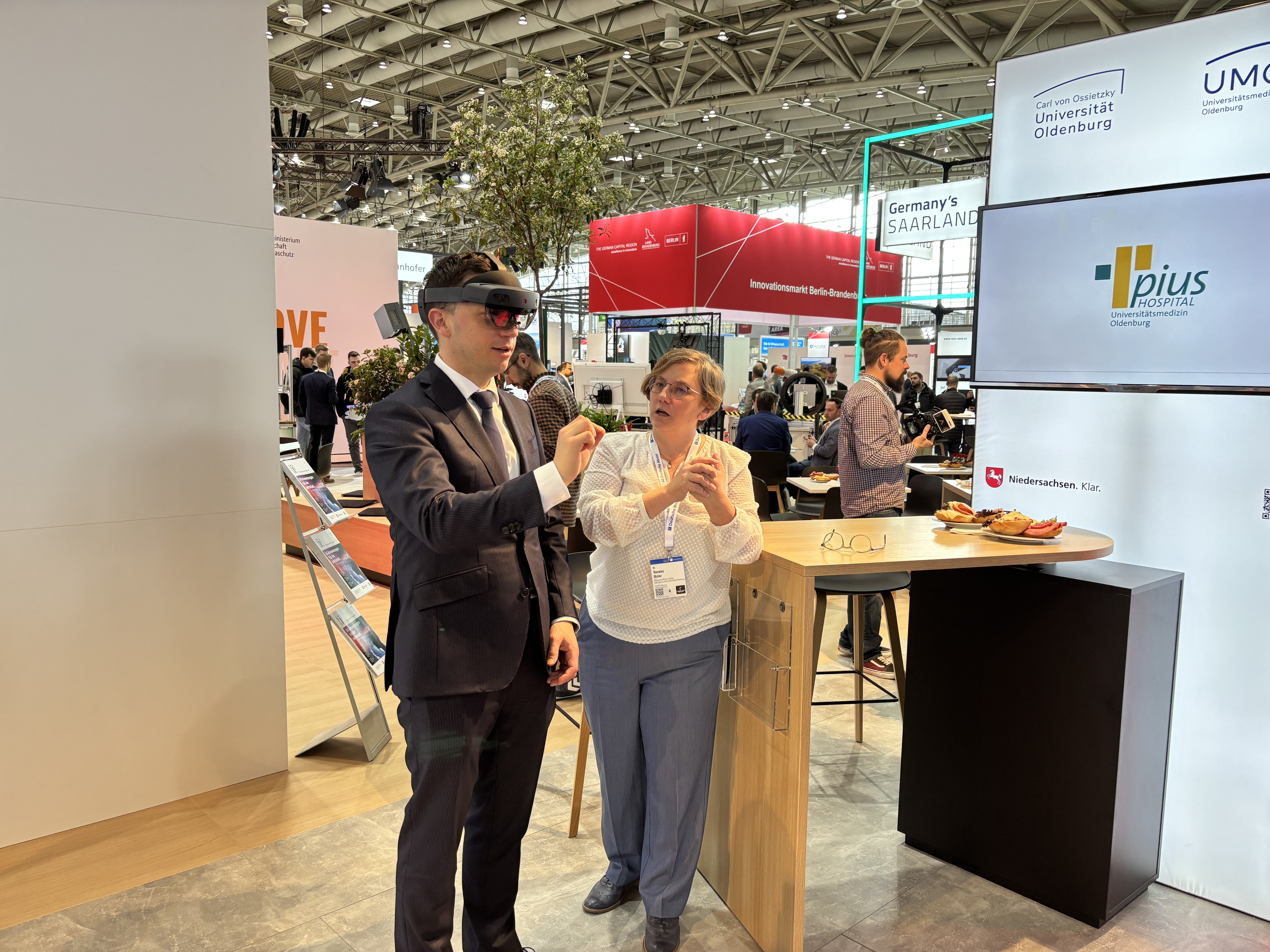 Wissenschaftsminister Falko Mohrs war bei der Hannover Messe 2025 zu Besuch am Gemeinschaftsstand des Ministeriums und hat sich mit den Präsentationen aller 14 Aussteller vertraut gemacht. Sein Statement: "An unseren Hochschulen und Forschungseinrichtungen in Niedersachsen entstehen täglich neue Ideen, neues Wissen und neue Technologien. Eindrucksvoll zeigt sich das auch an unserem Gemeinschaftsstand auf der Hannover Messe. Vom Tracking zur Bergung von verlorenen Schiffscontainern über innovative Verfahren zur nachhaltigen Wasserstoffherstellung, Einblicke in die niedersächsische Quantenexpertise und den Einsatz von Augmented Reality im Klinikalltag bis hin zur Forschung für eine umweltfreundlichere Luftfahrt. Anhand dieser und vieler weiterer Beispiele wird die Innovationskraft des Wissenschaftsstandorts Niedersachsen erlebbar."