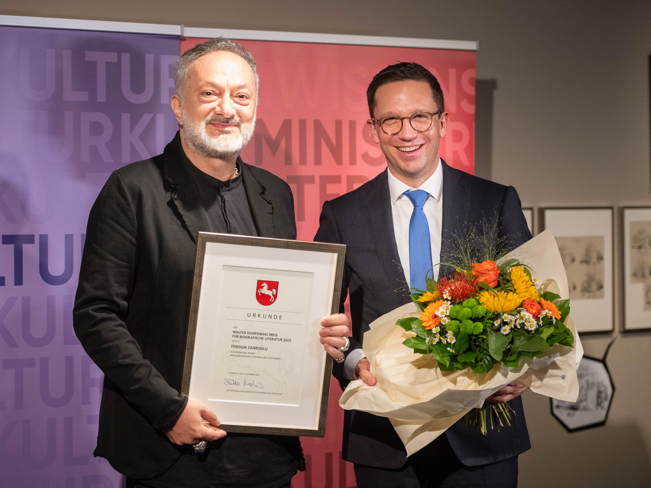 Schriftsteller Feridun Zaimoglu wurde von Kulturminister Falko Mohrs mit dem Niedersächsischen Literaturpreis 2025 - dem Walter Kempowski Preis für biografische Literatur - ausgezeichnet. Das Land Niedersachsen vergibt den Walter Kempowski Preis für biografische Literatur alle zwei Jahre an herausragende Schriftstellerinnen und Schriftsteller, denen es in ihren Texten gelingt, die Einflüsse und Auswirkungen zeitgeschichtlicher Ereignisse auf die individuelle Biografie darzustellen.