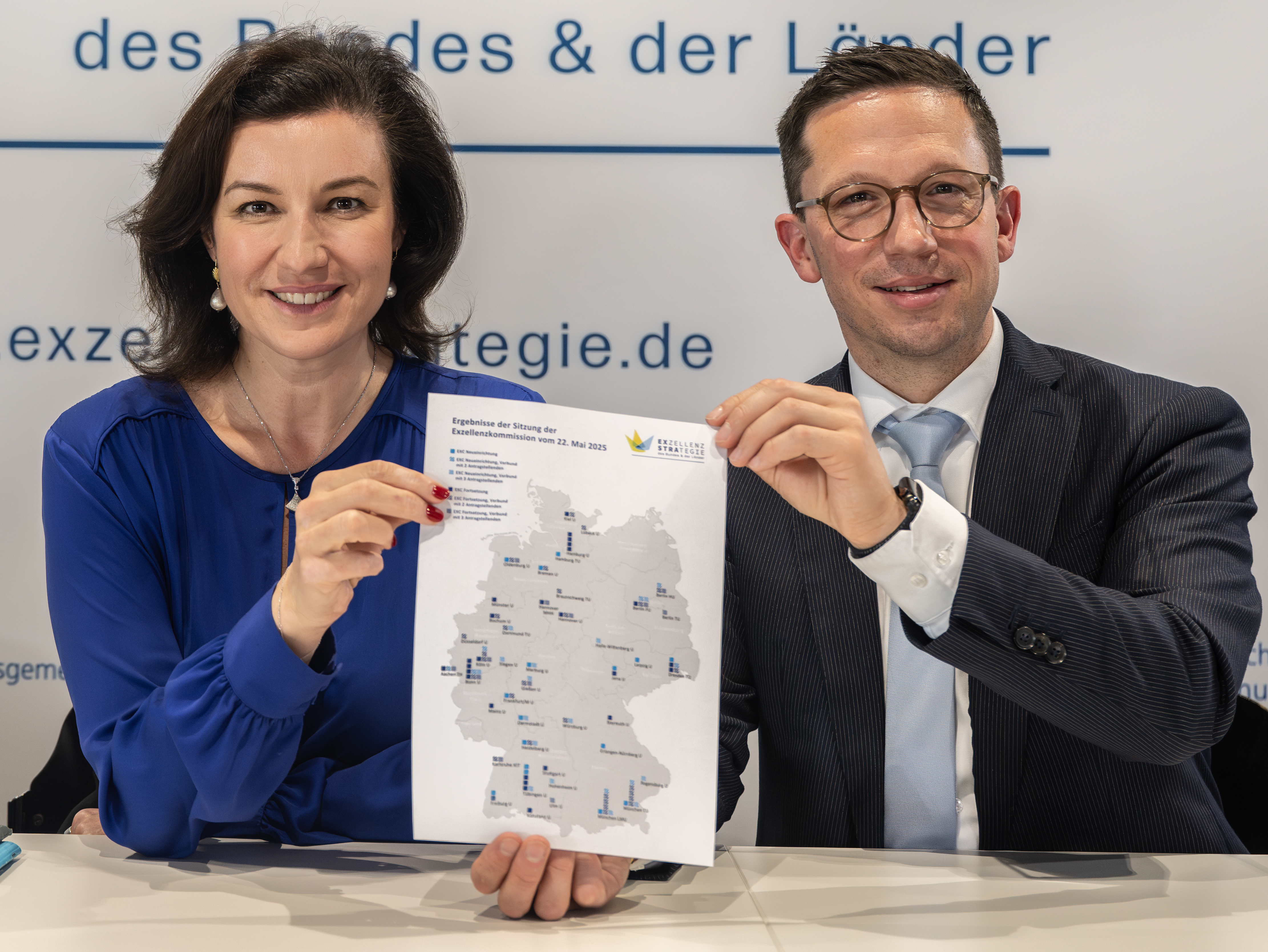 Minister Falko Mohrs hat in seiner Funktion als Vorsitzender der Gemeinsamen Wissenschaftskonferenz zusammen mit Bundesministerin Dorothee Bär bekannt gegeben, welche Forschungsvorhaben die begehrte Förderung als Exzellenzcluster erhalten. Insgesamt sechs Forschungsprojekte aus Niedersachsen wurden ausgewählt. Die Ergebnisse hat Minister Mohrs am darauffolgenden Tag außerdem bei einer Pressekonferenz mit den Rektorinnen und Rektoren der erfolgreichen niedersächsischen Hochschulen präsentiert.