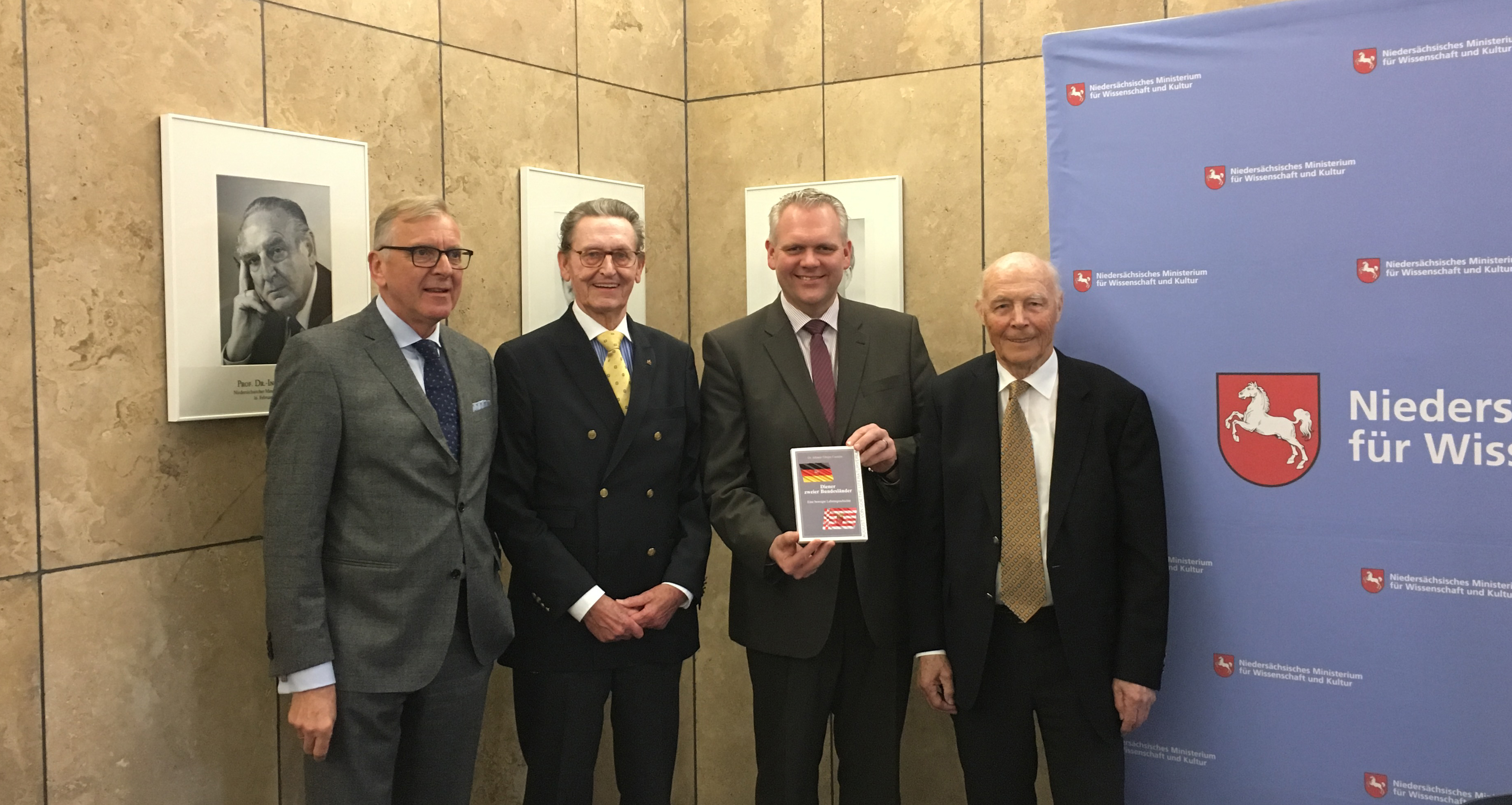 „Diener zweier Bundesländer“: So betitelt Niedersachsens ehemaliger Minister für Wissenschaft und Kunst (unter diesem Namen firmierte das Ministerium bis 1990), Dr. Johann-Tönjes Cassens, seine Biografie, die heute an seiner alten Wirkungsstätte vorgestellt wurde. Im Rahmen der Buchpräsentation würdigte der amtierende Minister für Wissenschaft und Kultur, Björn Thümler, das politische Lebenswerk Cassens‘: „Seine Biografie dokumentiert die zentralen Weichenstellungen, die die Amtszeit von Dr. Cassens für die Wissenschafts- und Kulturlandschaft in Niedersachsen mit sich gebracht hat. Damals wurden die Grundsteine für weitreichende Entwicklungen gelegt, von denen wir bis heute noch profitieren können. Erinnern möchte ich in diesem Zusammenhang beispielhaft an die Errichtung der Stiftung Niedersachsen, die aus der heutigen Kulturlandschaft Niedersachsens kaum wegzudenken wäre, den rapiden und umfassenden Auf- und Ausbau der Forschungslandschaft und den Erwerb des Evangeliars Heinrichs des Löwens.“