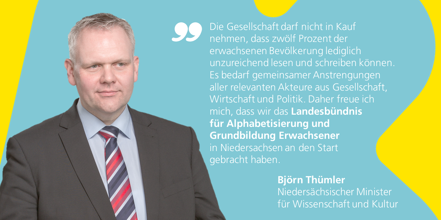 Das neue Bündnis will Menschen mit unzureichender Grundbildung durch geeignete Initiativen und Maßnahmen zu einer besseren beruflichen, sozialen und ökonomischen Teilhabe befähigen. „Ich freue mich, dass wir dieses neue Bündnis an den Start gebracht haben und habe gern die Schirmherrschaft dafür übernommen“, so Thümler. „Wir verfolgen ein gemeinsames Ziel: Wir wollen möglichst viele Menschen mit Lese- und Schreibschwierigkeiten erreichen sowie deren Umfeld, um ihnen Wege zu einem selbstbestimmten Leben zu ermöglichen.“